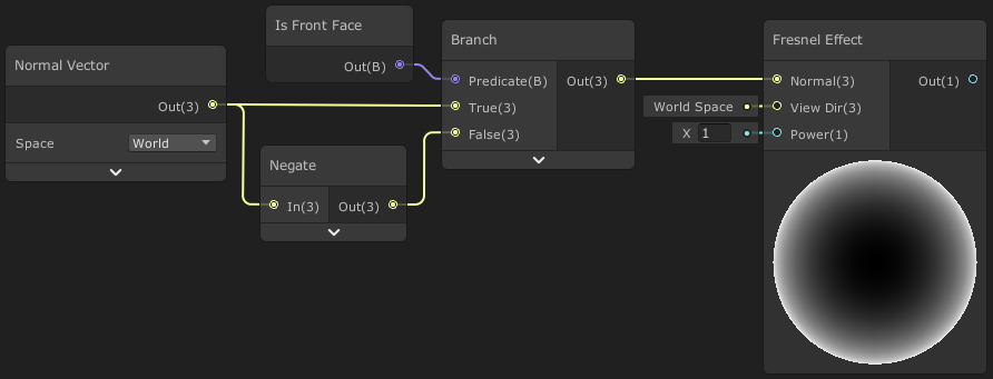 셰이더가 Transparent이고 Two Sided를 사용 하는 경우 메시의 법선은 일반적으로 뷰 방향에서 멀리 떨어져 있으므로 1 을 반환 합니다. 이것이 의도한 결과가 아니라면 이를 방지하기위해 Normal Vector 입력을 뒤집어서 Is Front Face 노드와 함께 Branch를 사용하여 앞면에 대한 프레넬효과 출력을 할 수 있습니다.