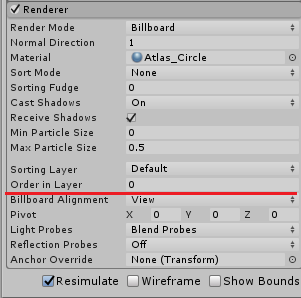 파티클의 Draw order를 지정하지 않으면 dynamic batching이 일어나지 않을 가능성이 있으므로 Order in Layer를 지정하여 그리는 순서를 정하도록 한다.
