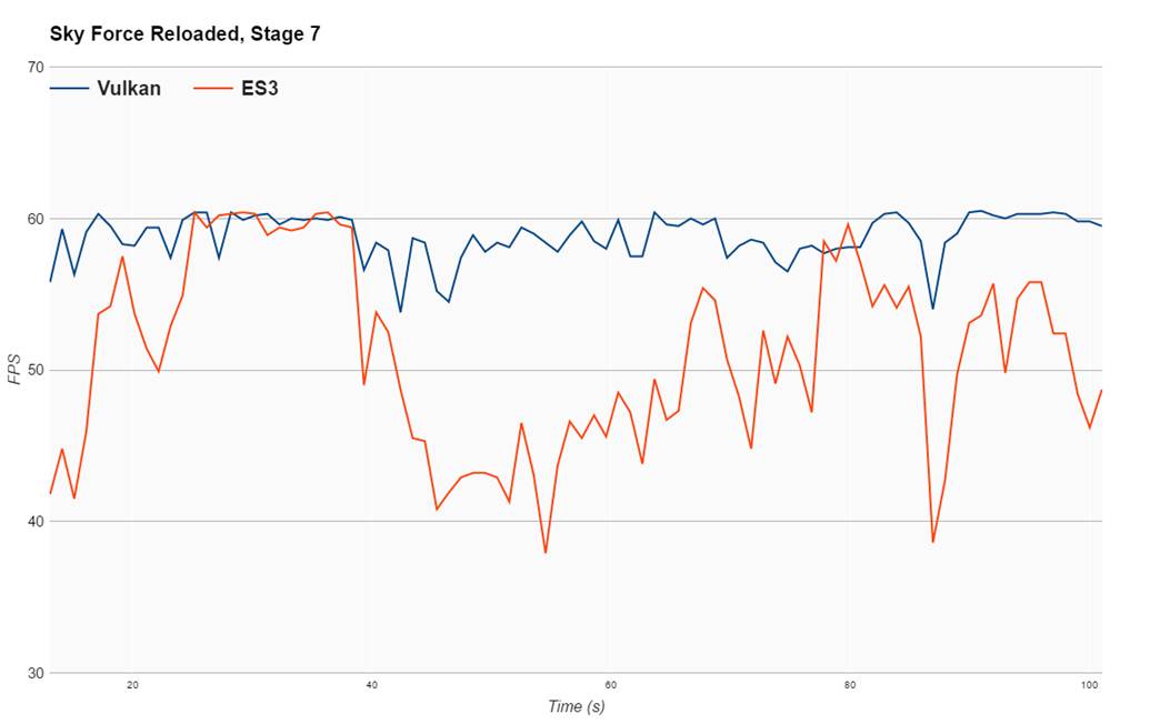 다음 그래프에서 Vulkan은 OpenGL ES가 어려움을 겪는 동안 대부분의 시간 동안 60FPS를 유지할 수 있음을 알 수 있습니다. 전반적인 성능 향상은 OpenGL ES보다 15 % 높습니다. 팀은 Vulkan이 그래픽 API 일 뿐이라는 점을 고려할 때 이것이 매우 좋은 결과라고 생각했습니다.