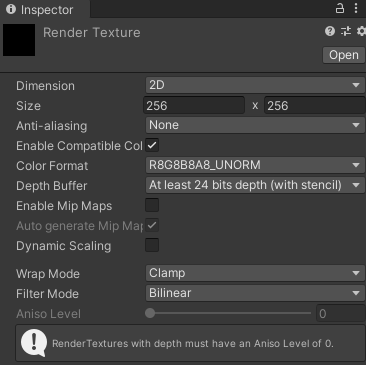 렌더 텍스처에는 색상 형식에 대한 몇 가지 옵션이 있으며 일부는 '호환 가능한 색상 형식 활성화'가 유용한 대상 플랫폼에서 지원되지 않을 수 있습니다. 형식 이름이 R8G8B8A8_UNORM 인 경우 이는 렌더 텍스처에 Red , Green , Blue 및 Alpha에 대한 채널이 있으며 각각 8 비트 (총32비트)가 있음을 의미합니다. 모든 채널이 필요하지 않은 경우 메모리를 절약하기 위해 더 적은 형식을 사용하세요. 예를 들어 R8_UNORM 에는 빨간색 채널 만 있습니다. 채널당 8 비트를 사용하면 16 비트 보다 적은 메모리를 사용 하거나채널당 32 비트이지만 사용 가능한 색상 수가 줄어 듭니다.
